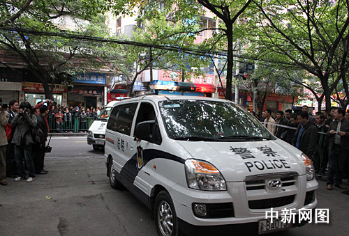 图为押解谢才萍涉黑团伙的警车相继进入法院。郭虹 摄