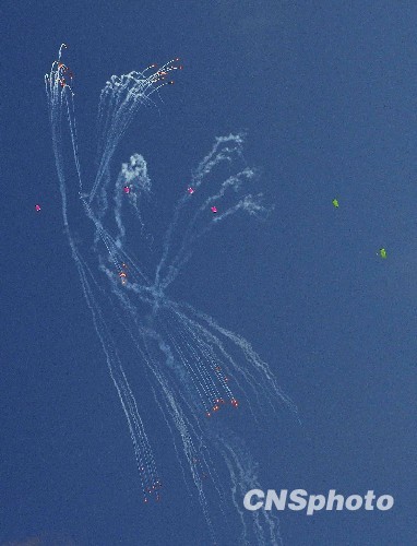 图为空军八一跳伞队表演的天女散花。中新社发 潘旭临 摄