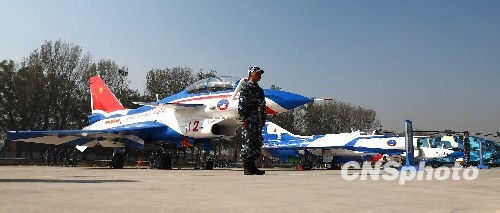 图为八一飞行表演队刚刚换装的“歼十表演机”(左一)。中新社发 富田 摄