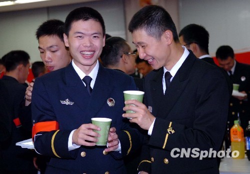 图为中日海军学员在当晚的欢迎宴会上愉快交流。中新社发 朱沿华 摄