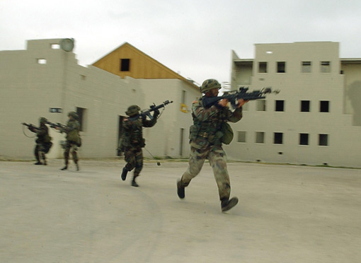 图为美国士兵在胡德堡陆军基地训练的资料图。