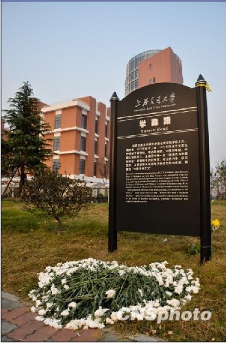 11月6日,“中国航天之父”钱学森的追悼会在北京八宝山举行。图为上海交大闵行校区学森路上,堆成心形的小白菊悼念钱学森。中新社发 邹瑞玥 摄