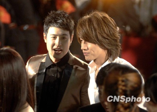 台湾歌手言承旭、潘玮柏福州出席第七届特步东南劲爆音乐榜颁奖盛典。中新社发 王东明 摄