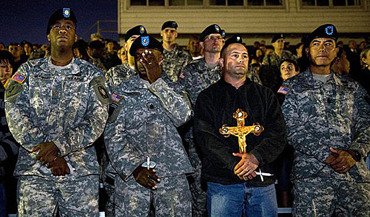美国得克萨斯州胡德堡陆军基地为枪击案死难者举行烛光守夜活动。