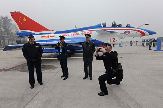 11月8日上午10时在北京昌平沙河空军机场举行的空军60周年庆典首场空中表演因天气原因取消,但空军武器装备静态展活动没有受到影响,来自各国的军队高官和空军离退休干部及家属,一起参观了空军主战装备。