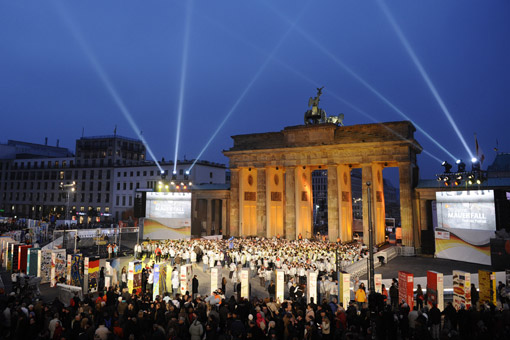 11月8日,由1000多块泡沫塑料排成的多米诺骨牌亮相柏林市中心。11月9日,该多米诺骨牌将被推倒以此纪念柏林墙倒塌20周年。