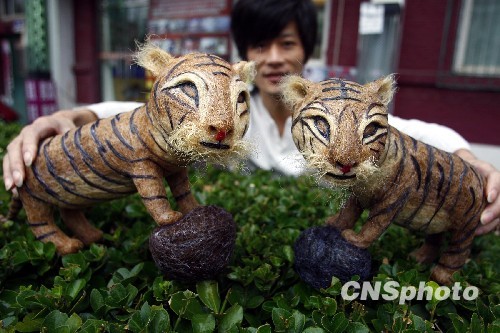 11月9日,北京一位时尚发型设计师正在展示头发丝作品“福虎神威”贺岁虎年。这是祖国60华诞之后的又一新作,四川青年理发师黄鑫用2.6公斤碎头发制作了一对可爱逼真的“福虎”,历时两个多月的时间才完工。中新社发 郑雄增 摄