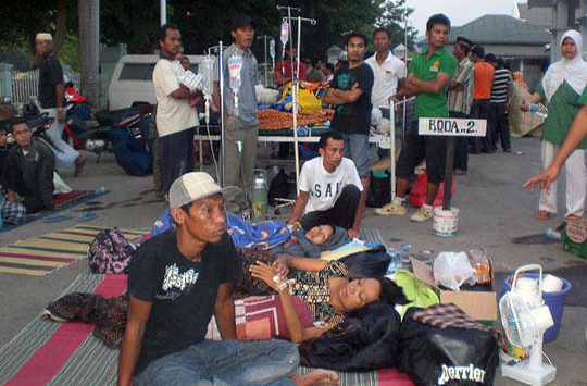 图为印尼一家公立医院的病人被转移到户外空旷地带。