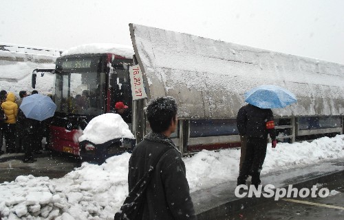 图为石家庄公交枢纽站候车亭顶被积雪压塌。中新社发 宋敏涛 摄