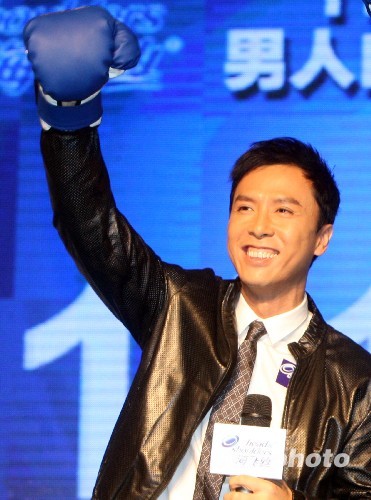 图为11月11日晚,香港功夫巨星甄子丹在上海出席某品牌举办的首届“男人节”,与千名男士一起佩带起象征力量与活力的拳击手套,“挥拳”道出男人心声。中新社发 汤彦俊 摄