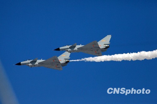 图为八一飞行表演队用歼十做飞行表演训练。中新社发 卢炳广 摄