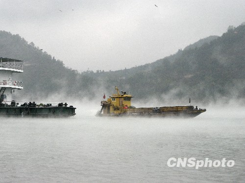 图:三峡蓄水大坝下游呈现雾景