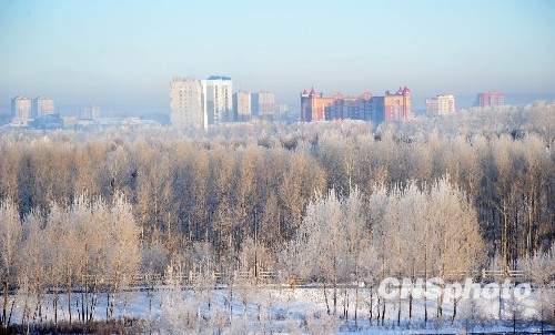 中俄界河黑龙江黑河段雾凇景观,成为中俄边城初冬一道靓丽风景。中新社发 邱齐龙 摄