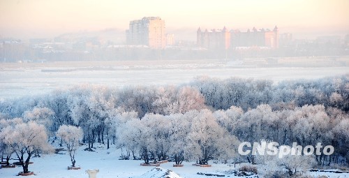 中俄界河黑龙江黑河段雾凇景观,成为中俄边城初冬一道靓丽风景。中新社发 邱齐龙 摄