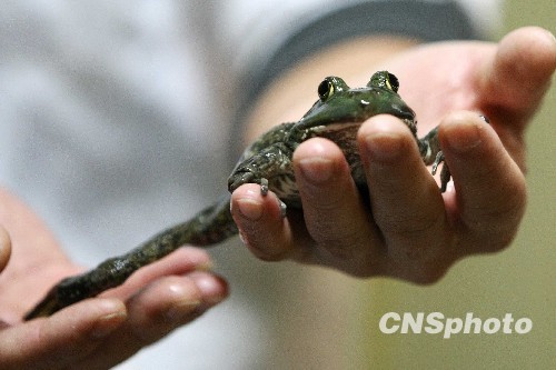 近日,家住北京丰台区的徐先生得到朋友赠送的一只只有三条腿的蛤蟆,徐先生称,这只很像传说中招财的“金蟾”。中新社发 富田 摄
