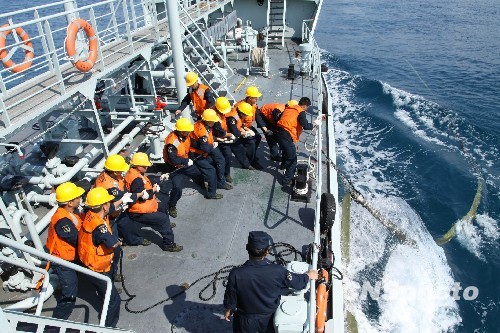 11月13日,南海舰队某勤务船大队组织舰艇进行海上补给训练。连日来,该大队将各型油船、水船、运输船拉到某海域,进行横向、纵向及舷靠补给训练,锤炼官兵海上实作补给技能和协同训练水平,提高部队海上综合保障能力。 图为官兵打捞补给探头。中新社发 刘林 摄