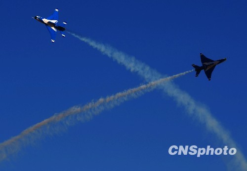 庆祝中国人民解放军空军成立60周年飞行表演,11月15日上午在北京沙河机场举行。表演按八一飞行表演队4架歼-10飞机表演12个动作和6架歼-7GB飞机表演15个动作,分四机对头交叉、四机菱形队大坡度盘旋、单机小速度平飞等27个动作,其中四机对头交叉动作是这次表演中技术难度较大的动作之一,这是国产三代飞机和国产二代飞机首次同场竞技表演。图为歼-7GB进行表演。中新社发 宋吉河 摄