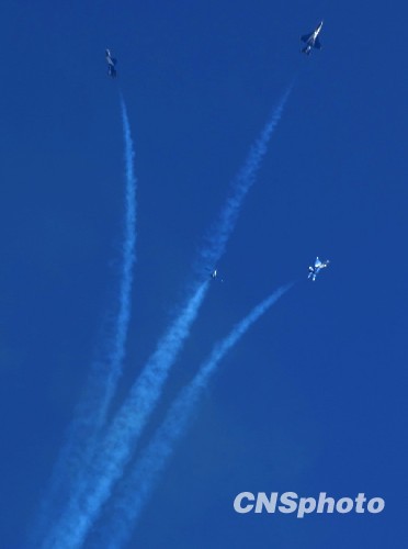 庆祝中国人民解放军空军成立60周年飞行表演,11月15日上午在北京沙河机场举行。表演按八一飞行表演队4架歼-10飞机表演12个动作和6架歼-7GB飞机表演15个动作,分四机对头交叉、四机菱形队大坡度盘旋、单机小速度平飞等27个动作,其中四机对头交叉动作是这次表演中技术难度较大的动作之一,这是国产三代飞机和国产二代飞机首次同场竞技表演。图为四机向上开花。 中新社发 宋吉河 摄