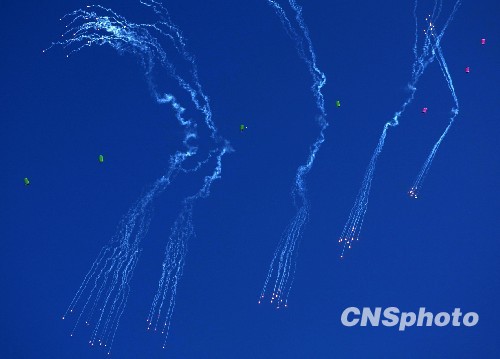 庆祝空军成立60周年跳伞表演犹如仙女散花。中新社发 宋吉河 摄