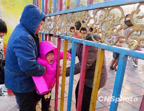 家长通过被锁住的铁门栏杆间缝隙将孩子塞进幼儿园。中新社发 曹福川 摄