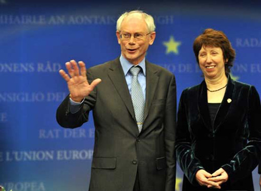 欧盟特别峰会于当地时间十九日在比利时布鲁塞尔召开,比利时首相赫尔曼·范龙佩(Herman Van Rompuy )当选为首位欧洲理事会常任主席,来自英国的欧盟贸易委员凯瑟琳·阿什顿(Catherine Ashton)当选为欧盟外交和安全政策高级代表。