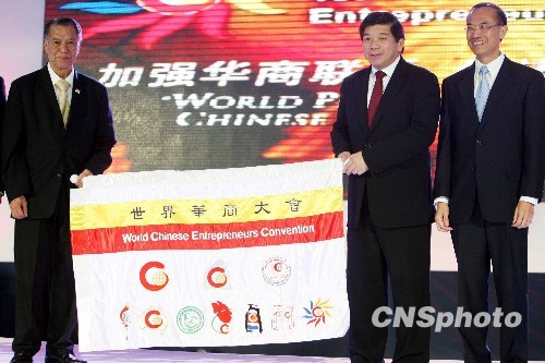11月21日,“第十届世界华商大会”在菲律宾马尼拉举行闭幕式。本届世界华商大会主席陈永栽(左)将会旗移交给第十一届世界华商大会主办国新加坡外长杨荣文(右)及中华总商会会长杨松声。中新社发 洪少葵 摄