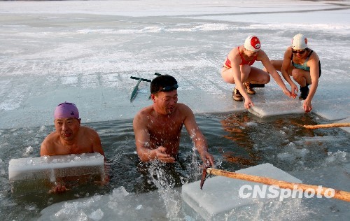 图:哈尔滨冬泳人下松花江采冰(2)
