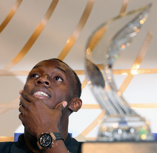 图为荣膺国际田联2009年度最佳男运动员的牙买加“飞人”博尔特。