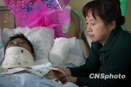 图为一开拓区113队矿工袁树胜的妻子高淑芹在护理受伤的丈夫。中新社发 房宝树 摄
