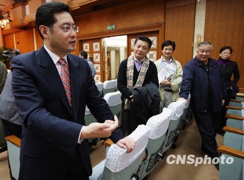 11月24日,一场外交部例行记者会后,外交部新闻发言人秦刚走到前来旁听的北京二中老师中间,与老师们畅谈中国的外交关系,并详细介绍了发言人制度和一名发言人必备的各种素质。中新社发 刘震 摄