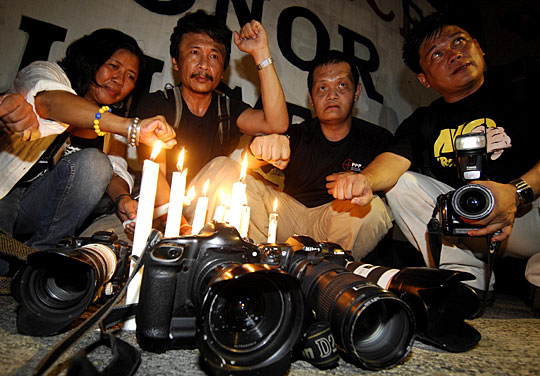 11月24日,菲律宾全国记者协会的数百名新闻工作者在菲律宾首都马尼拉举行烛光集会,为惨遭杀害的同行伸张正义,同时要求政府不要隐瞒真相。菲律宾军方24日说,菲律宾安全部队当天又发现25具日前遭武装分子绑架的人的遗体,加上23日发现的21具遗体,从而使这次政治绑架和屠杀事件的遇害者人数上升到了46人。