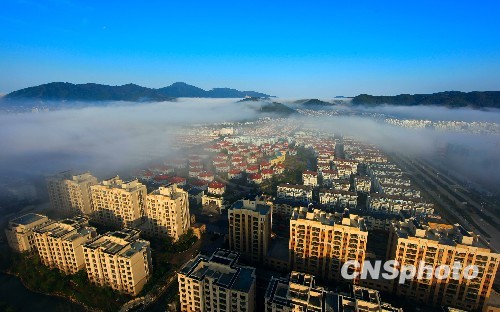 11月25日、26日,浙江象山半岛连续两天出现罕见的平流雾。象山半岛成为“天上人间”,高楼、山脉如坠云里,若隐若现。 平流雾是暖湿空气移到较冷的陆地或水面时,因下部冷却而形成的雾,通常发生在冬季,持续时间一般较长,范围大,雾较浓,厚度较大,可达几百米。中新社发 杨忠华 摄