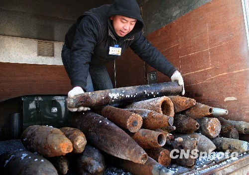 11月27日,沈阳市公安局治安警察支队在位于沈北新区石佛寺乡沙岗子村附近的辽河河套内,对近半年从社会面收缴的418枚废旧炮弹、230枚雷管以及手榴弹、手雷、报废炸药等物品进行了集中统一销毁。中新社发 黄金昆 摄