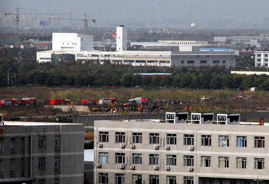 11月28日晨,一架津巴布韦MD11货机在浦东机场起飞后坠毁,3人死亡。图为上海浦东机场的货机坠毁现场。