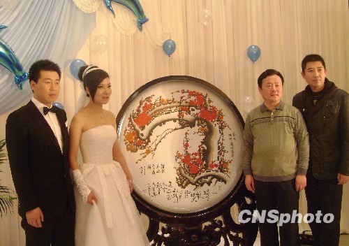 11月29日,备受瞩目的奥运冠军庞伟、杜丽婚礼在位于河北保定的锦江国际电谷酒店隆重举行。中国射击队总教练王义夫亲临现场,并为新中国体育史上第一对奥运冠军伉俪证婚。图为杜丽“娘家人”山东淄博市体育局向两新人赠送淄博刻瓷大礼——腊梅盛开。中新社发 吕子豪 摄