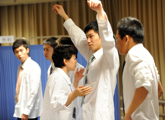 “身体初检”环节,医生用鼻子嗅着“空少”应聘者的腋下,以鉴定是否有狐臭。高原 摄