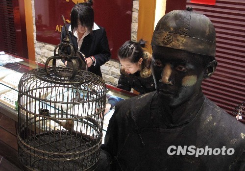 十一月二十九日,化妆成清末八旗子弟的活体雕塑在北京前门步行街一家珠宝私营店内成为醒目广告,其纹丝不动的状态足以以假乱真,吸引不少好奇的消费者。中新社发 邹宪 摄