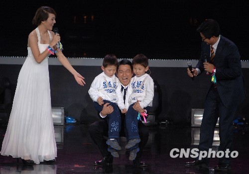 图为刘德华一口气抱起双胞胎聋儿小朋友,大秀亲昵。中新社发 李学仕 摄