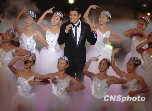 图为刘德华与残疾人艺术团携手演唱《爱你一万年》。中新社发 李学仕 摄
