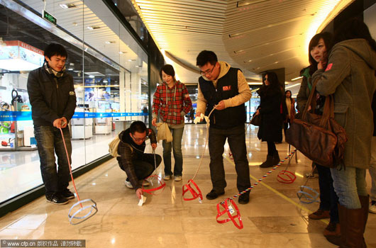 11月29日,一群网友聚集在北京三里屯,他们牵着“隐形狗”,劝导人们周末不上网,应该拥抱大自然。蔡代征 摄
