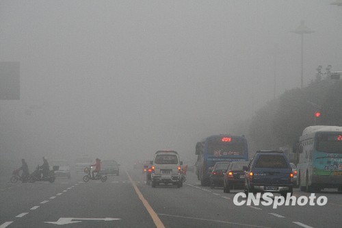 12月2日,扬州整座城市被大雾笼罩,能见度较低,市区的机动车辆都缓慢通行。江苏省气象台、扬州市气象台都发布了大雾黄色预警信号。中新社发 崔佳明 摄