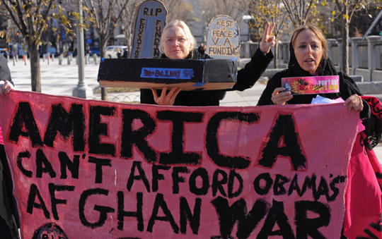 12月1日,美国反战人士在华盛顿白宫附近举行示威活动,反对美国政府向阿富汗增兵。当地时间1日晚,美国总统奥巴马发表全国电视讲话,宣布向阿富汗增兵3万人。