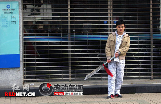 25岁的益阳桃江男子刘斌(化名)持马刀立在银行门口,引发黄兴路由南往北方向交通堵塞近一个半小时。据了解,男子有间歇性的精神问题。 张必闻 摄