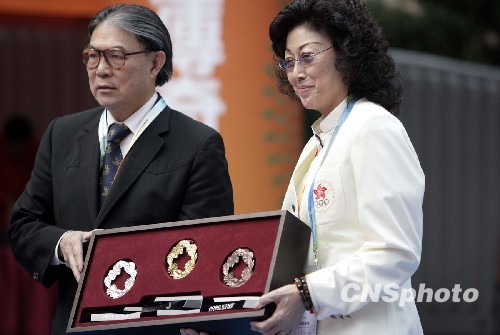 图为本届香港东亚运代表团团长刘掌珠接受纪念品。中新社发 张勤 摄