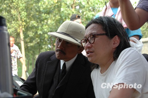 图为监制陈可辛与“国父”造型的张涵予(左)在拍摄现场。中新社发 人人 摄