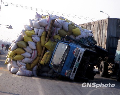 12月7日下午,江苏连云港市新牛公路岗埠农场附近发生一起意外交通事故,一辆满载成袋稻谷的四轮货车由于不堪重负当街倾翻倒公路边上,车上的驾驶员被困后,推开已变形的车门,艰难爬出驾驶室。事故没有造成人员伤亡。经过交管部门的疏导,道路交通秩序很快得到恢复。 中新社发 蔡晓雨 摄