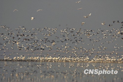 12月6日,数万只珍禽候鸟在江西永修县吴城镇大湖池栖息飞翔。据当日鄱阳湖自然保护区9大湖区监测站统计数据,目前,包括白鹤、东方白鹳、白枕鹤、灰鹤、白琵鹭、小天鹅、雁鸭类、鸻鹬类等,共28万只珍禽已抵达江西鄱阳湖自然保护区越冬栖息。中新社发 段长征 摄
