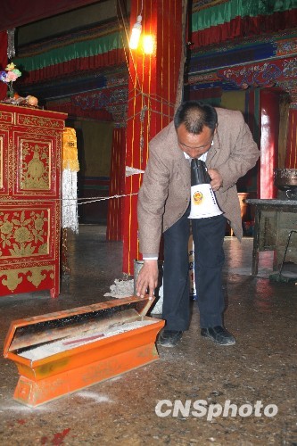 图为工作人员在展示铁皮香炉。中新社发 徐长安 摄