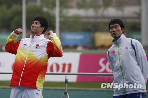 图:刘翔夺东亚运冠军 领奖台上轻松搞怪(2)