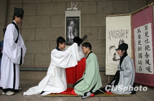 武汉大学一名大学生在孔子像前,身着汉服用传统的“冠礼”举行成人礼。 中新社发 孙新明 摄